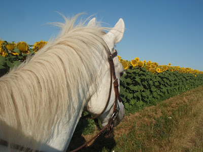 die Sonnenblumen sehen herrlich aus, die Mähdrescher brummen, der Rehbock klagt, die Grillen zirpen, die Oma jammert, im Nachbarort wird bis Mitternacht noch fleißig und lautstark für das Musical auf der Felsenbühne geprobt - hört man bis zu uns auf die Terrasse (übermorgen ist Premiere), es sind wiedermal bis zu 37° Grad angesagt und wir mittendrin ;-).